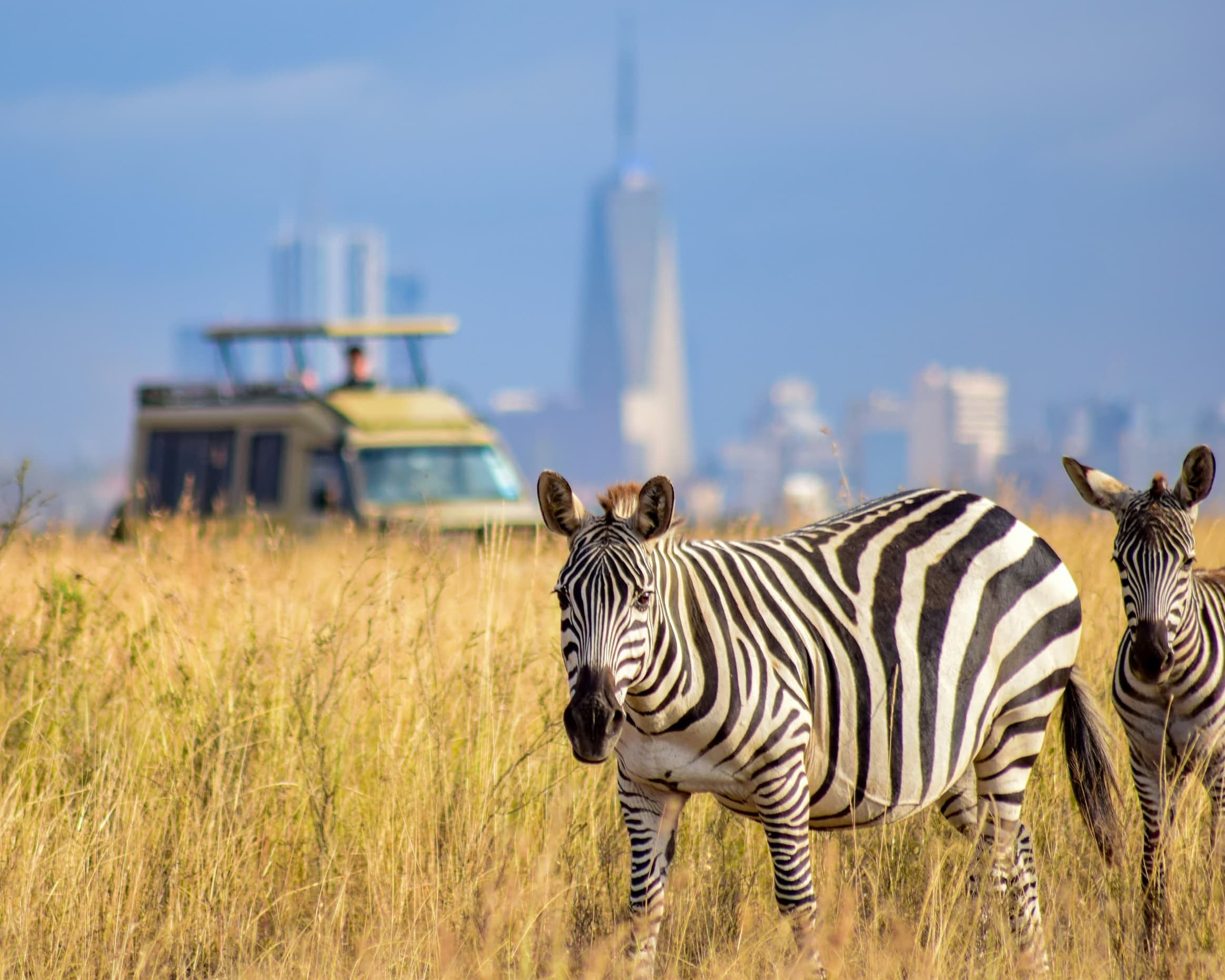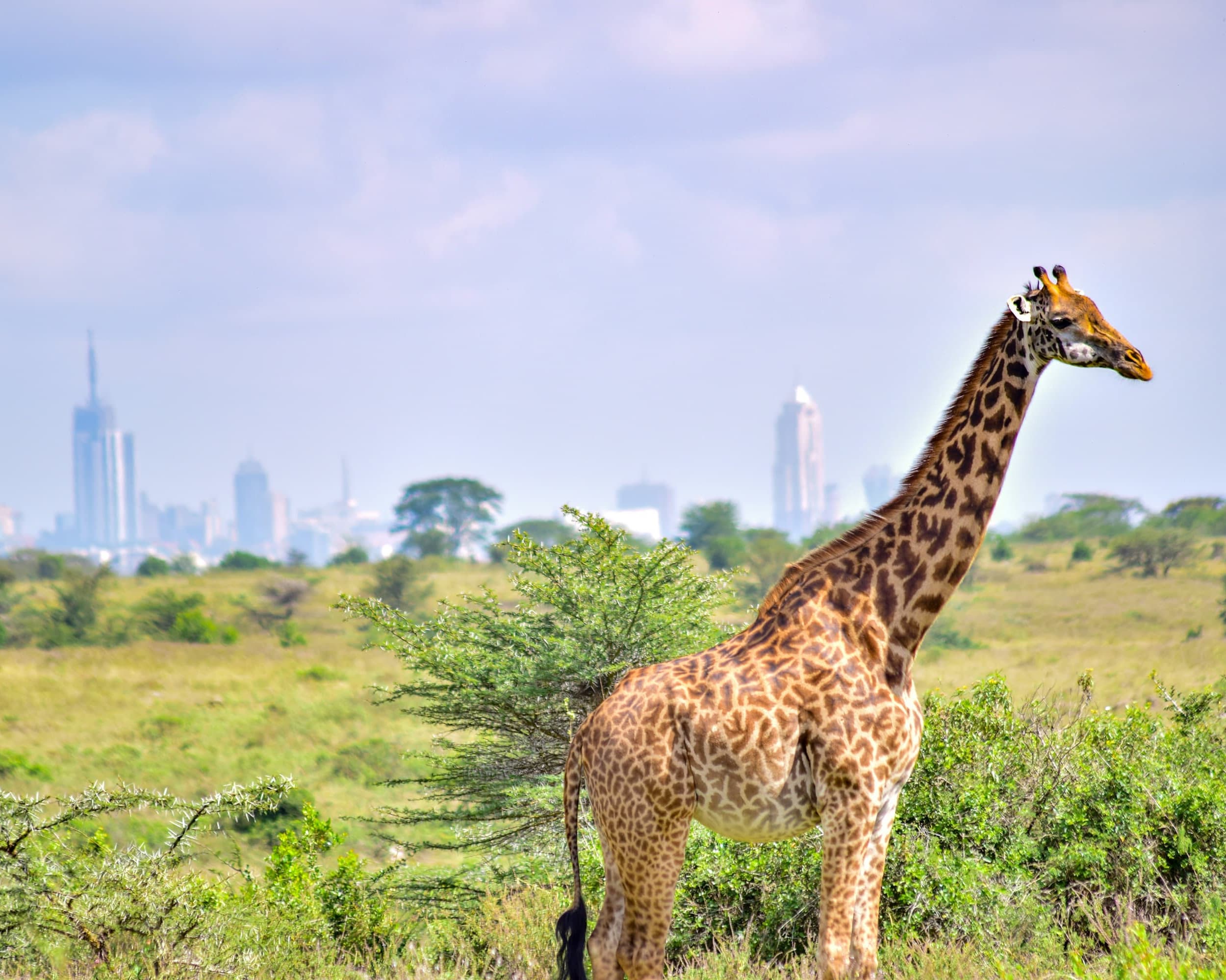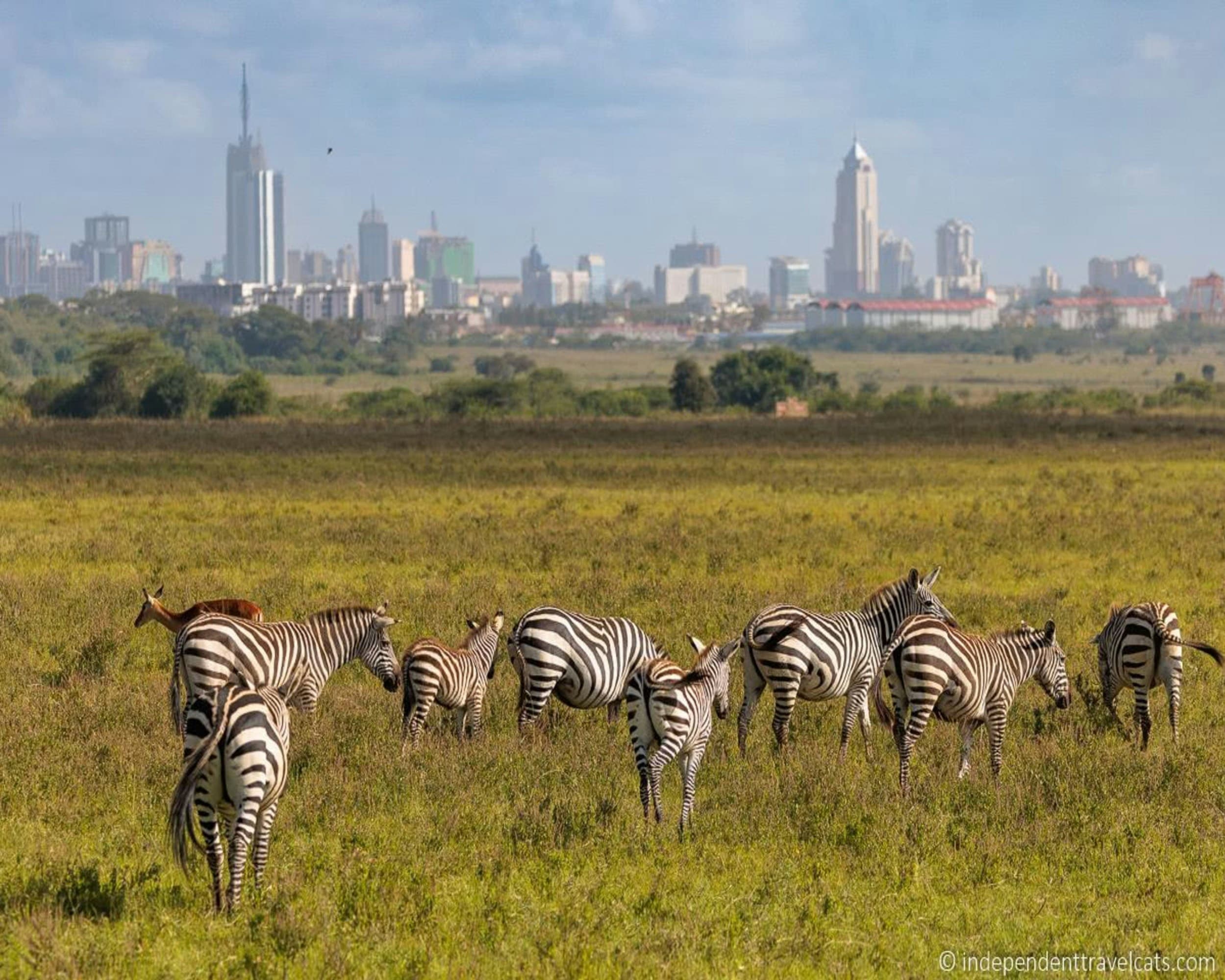 Nur eine kurze Fahrt vom zentralen Geschäftsviertel Nairobis entfernt liegt der Nairobi-Nationalpark. Offene Grasflächen, die von der Stadtsilhouette im Hintergrund und verstreut stehenden Akazienbüschen geprägt sind, bieten Lebensraum für eine große Vielfalt an Wildtieren, darunter das gefährdete Spitzmaulnashorn, Löwen, Leoparden, Geparden, Hyänen, Büffel, Giraffen sowie eine vielfältige Vogelwelt mit über 400 registrierten Arten.