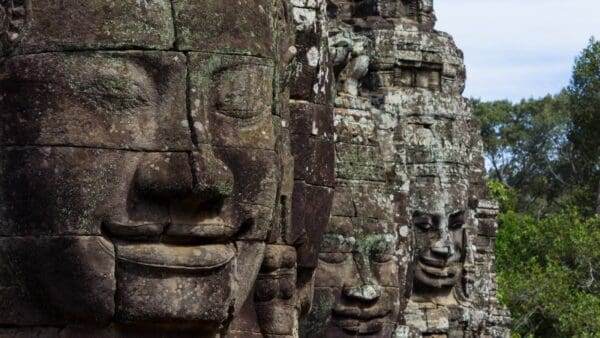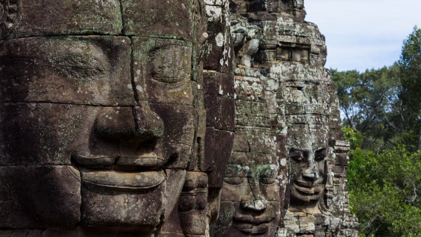 Angkor Thom Tempel: Ende des 12. Jahrhunderts erbaut, war Angkor Thom die Hauptstadt des Khmer Reiches. Nördlich von Angkor Wat gelegen, umschließt sich dieses etwa 10 km² große Areal mit acht Meter hohen Mauern. „Angkor Thom“ bedeutet „große Stadt“. Sie wurde neue Hauptstadt nach der Zerstörung der ehemaligen Hauptstadt Yasodharapura durch die Cham. Jayavarman VII., ein starker König, ermöglichte das Khmer Reich auszudehnen, die Mauern um Angkor Thom zu verstärken und einen Wassergraben anzulegen. Angkor Thom umfasst viele bedeutende Orte wie Bayon, Baphuon, Phimeanakas, die Elefantenterrasse und den Palast von Jayavarman VII., der heute nicht mehr existiert.